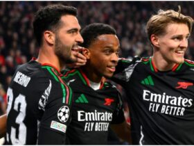 Trent Alexander-Arnold’s raking pass picked out Salah down the right flank and he glided away from Oleksandr Zinchenko into the area before smashing a fierce strike past David Raya at his near post.