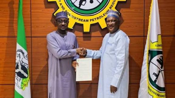 Mr Saidu Mohammed, new Authority Chief Executive, Nigerian Midstream Downstream Petroleum Regulatory Authority (NMDPRA) (Right) during handover by the outgoing Authority Chief Executive, Mr Farouk Ahmed.