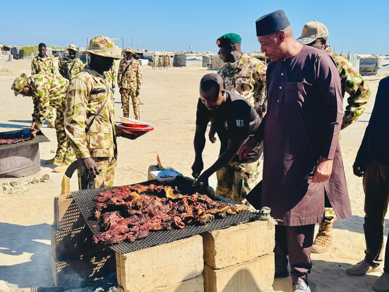 In the spirit of the season, Governor Zulum donated five bulls to the battalion to enable the troops to celebrate with dignity. In a rare personal gesture, he joined the soldiers in line, sharing a meal with them within the base.
